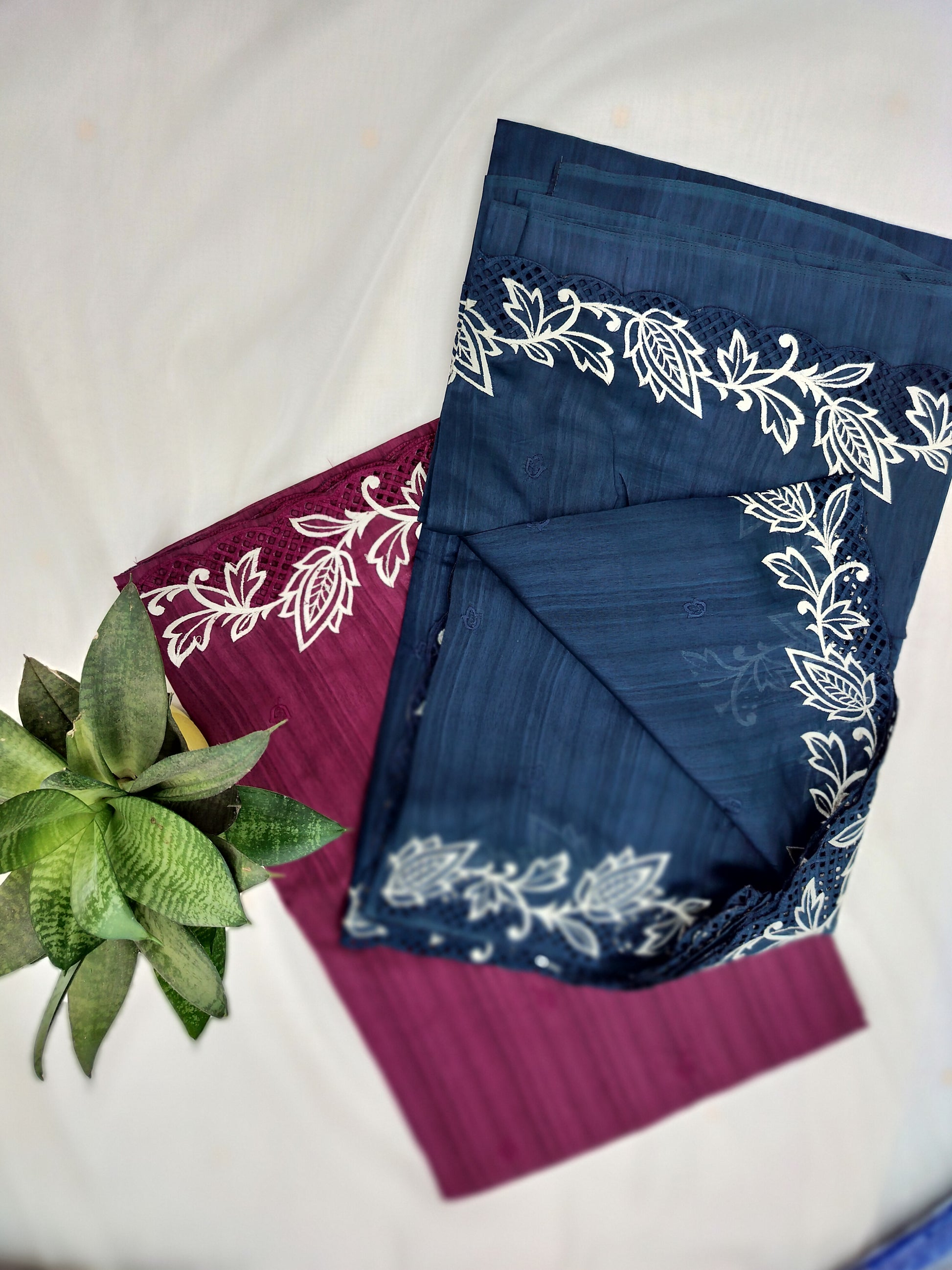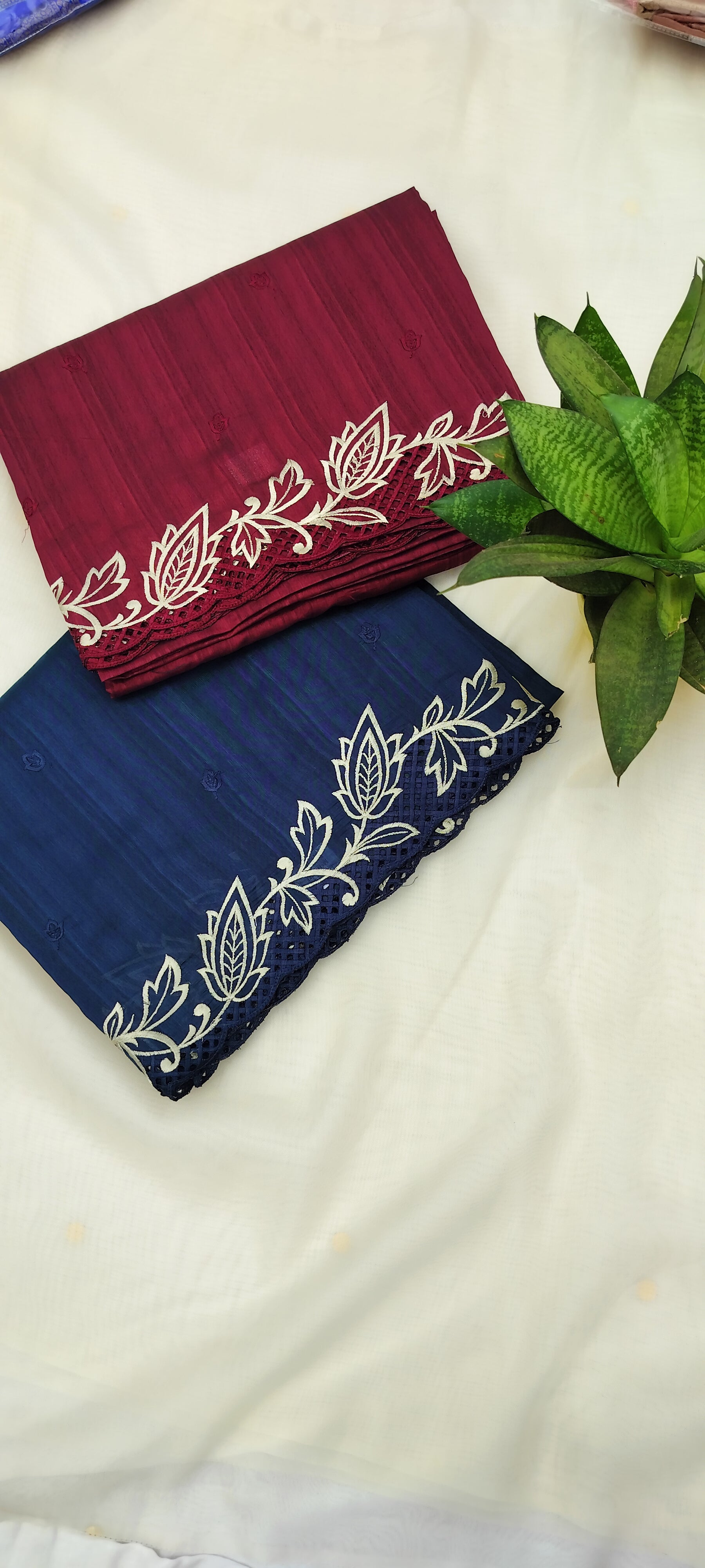 Elevate your style with this premium designer saree, crafted in a rich, glossy fabric that radiates shine with every movement. The saree is adorned with an intricately designed floral cut work border, giving it a refined and graceful appeal. Its soft texture drapes beautifully, making it perfect for festive occasions, parties, or special celebrations.